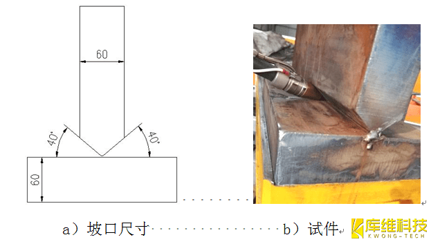 根據(jù)驅(qū)動(dòng)箱結(jié)構(gòu)特點(diǎn),制定機(jī)器人焊接工藝試驗(yàn)方案,試驗(yàn)件(T形焊接接頭)結(jié)構(gòu)如圖3所示,試驗(yàn)確定焊接參數(shù)。試驗(yàn)材料為Q355B,方案設(shè)計(jì)中針對(duì)背面焊縫不清根、焊接位置(橫焊/立焊)、不同鈍邊及組對(duì)間隙尺寸進(jìn)行焊接試驗(yàn),其中鈍邊尺寸分別為0、2mm、5mm,組對(duì)間隙分別為0、2mm、5mm。焊前對(duì)坡口及其周邊100mm進(jìn)行預(yù)熱,預(yù)熱溫度為100~150℃。焊后對(duì)焊縫進(jìn)行超聲波(UT)檢測,按照GB/T 11345 B級(jí)檢驗(yàn)、GB/T 29712 2級(jí)驗(yàn)收,并對(duì)焊接接頭進(jìn)行宏觀腐蝕觀察。如圖4所示。