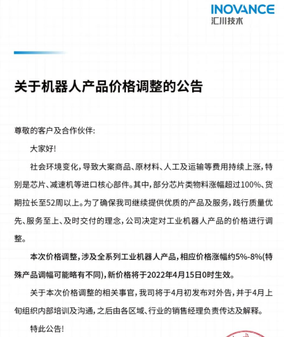 其實近來機器人產品漲價已并不鮮見,甚至發展成為了行業共性問題,今年以來,已經有匯川技術、阿童木機器人、爾必地、ABB、禾川、納博特、來福諧波等廠商公開宣布漲價,而私下調整價格的無疑有更多。
