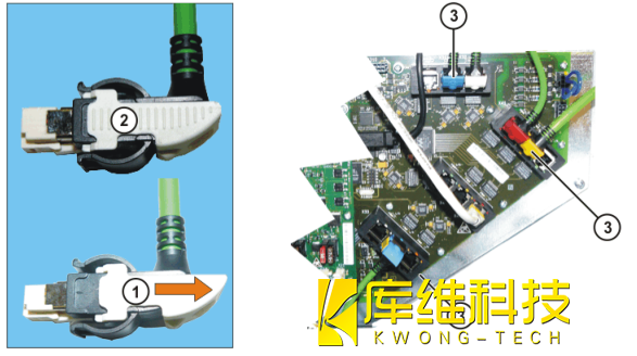 1. 關閉控制系統并采取確安措施防止未經授權的重啟2. 將數據線插頭解鎖拔出控制柜 (CCU ) 上的所有接線解鎖數據線插頭如下圖