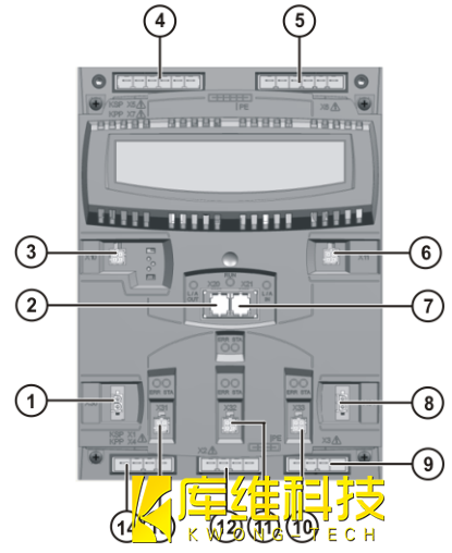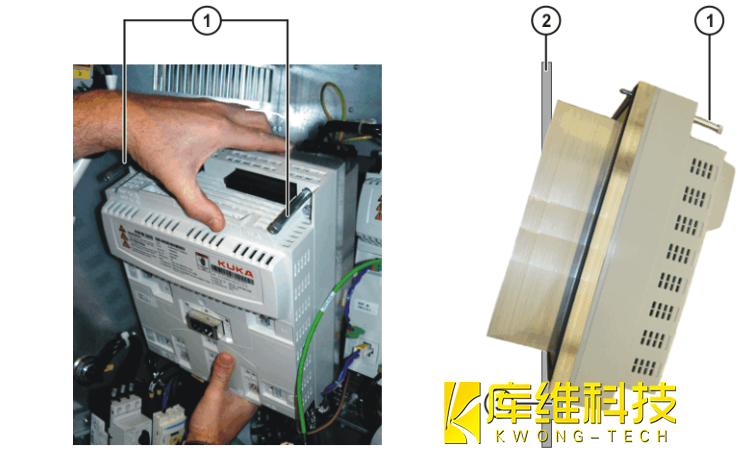 注意:KPP 的重量約為 10 kg. 在 KPP 的拆裝工作中存在擠傷危險(xiǎn)!請戴防護(hù)手套5. 將新的 KPP 插進(jìn)殼體支撐角鐵 (3)里,然后將其上部掛入角鐵并擰緊(擰緊扭矩 4 Nm)6. 按照插頭和線纜說明將所有接口插入. 將插頭 X20 和 X21 鎖緊.