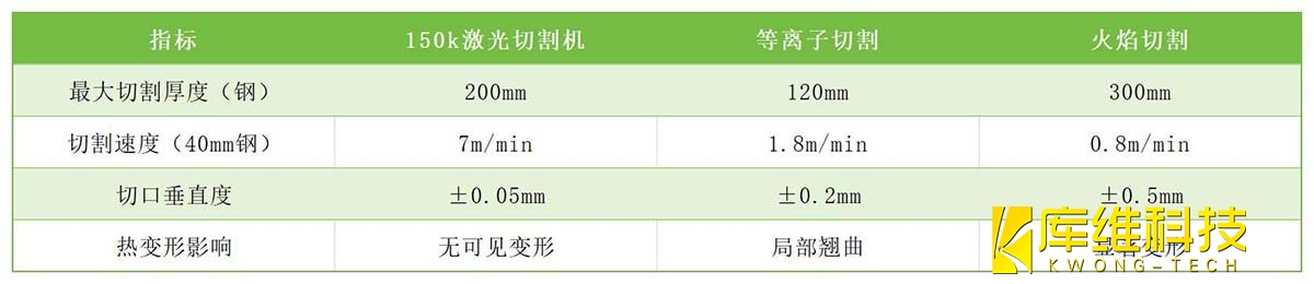 傳統等離子切割或水刀工藝在超厚板(≥40mm)加工中普遍面臨效率低、熱影響區大、切口粗糙等問題。而150k激光切割機通過以下技術參數實現跨越式升級: