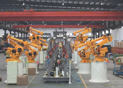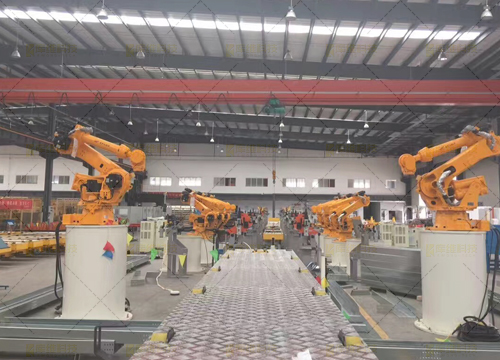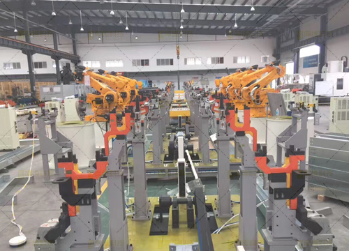 整線由彎板切割機器人工作站、中板坡口機器人工作站、座體機器人焊接工作站、中部槽機器人焊接工作站及中部槽總成機器人焊接線組成,包含整套機器人系統、機器人滑道、桁架梁、機器人焊接系統、兩軸變位機、彎板切割機、火焰割炬、激光跟蹤系統、焊接平臺、柔性組對工裝夾具、焊接電源、煙塵凈化系統等部分構成